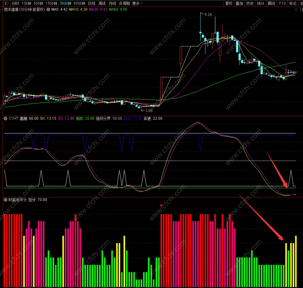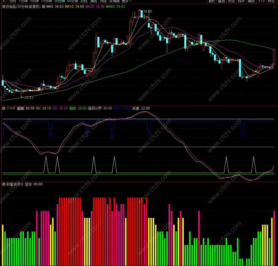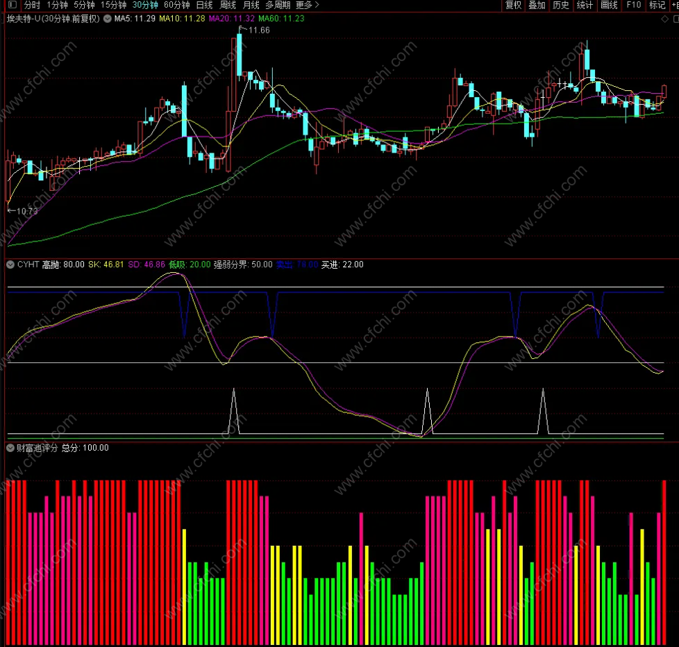由于是短线 、测试财运亨通指标,所以此次我们选择30分钟变盘个股进行跟踪。