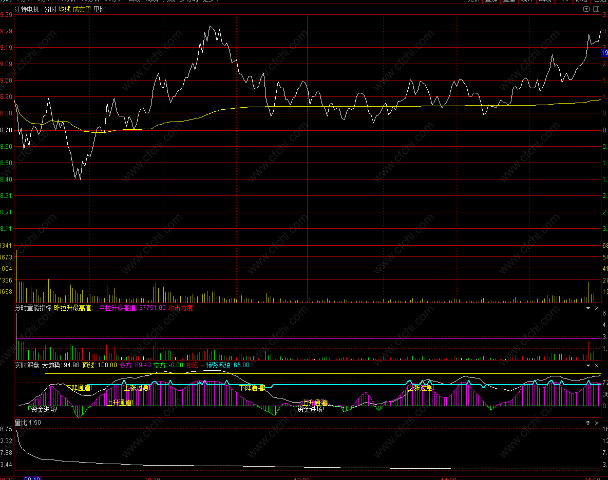 量比数值的缺陷是只表示出了某一时点上的量比数据,只能据此判断该点成交量相对过去几日平均成交量的变化,而不能依此确定当日盘口量能的相对变化。要解决这一缺陷,就必须查阅当日盘中过去时点上的量比。很明显,盘口任意时点的量比数值.只能从量比曲线上直观地看到。而量比数值变化表示当日量能变化的意义,从量比曲线的方向变化上看,更能一日了然。