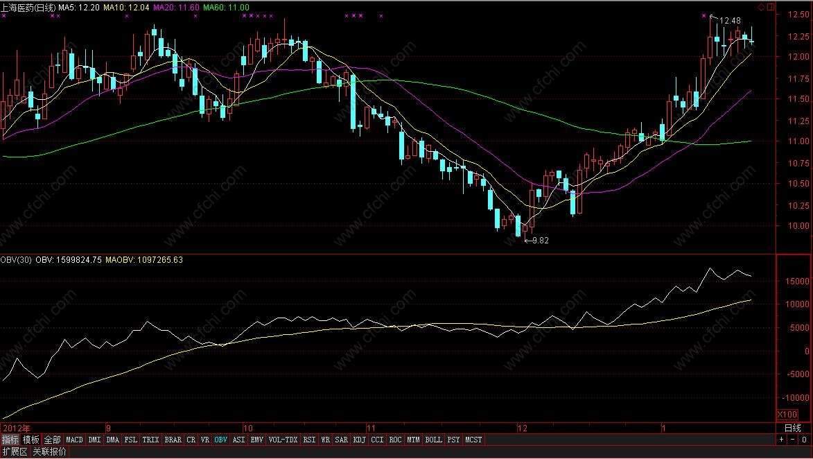 OBV也称为能量潮,是一位美国投资分析家在 1981年创立的,其理论基础就是能量是因、股价是果,从成交量的变化趋势可分析判断股价的转势。具体的计算公式是上一天的能量潮加减当天的成交量。当今天的收盘价高于前一天的收盘价,则当前的成交量就算为正数,是相加的,否则就是相减的。这样,无数个点就形成了累计能量线。这种计算是最基础的计算方法,有一些投资者会在此基础上进行一些修正和演绎。在多数情况下,该指标对于投资者的指导意义并不大,但在一些关键的转折时期其作用是相当明显的。
