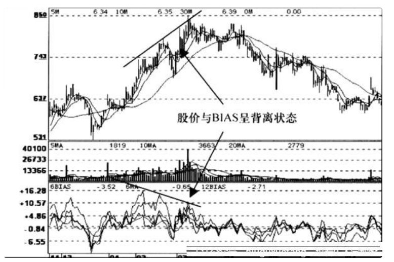 BIAS指标也经常会遇到与股价走势背离的现象。当股价的高点比前一次的高点高而指标的高点却比前一次的高点低,也就是当指标处于高位并形成一峰比一峰低的两个或两个以上的峰点,而此时股价却对应的是一峰比一峰高,就形成顶背离现象,则表示BIAS指标怀疑股价的上涨是外强中干,暗示股价很快就会反转下跌。