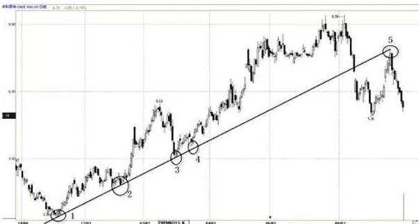 ● 首先要正确的画出趋势线,确定是由两个依次上升的低点做出的,要把上涨中的所有价格变化涵盖在内。