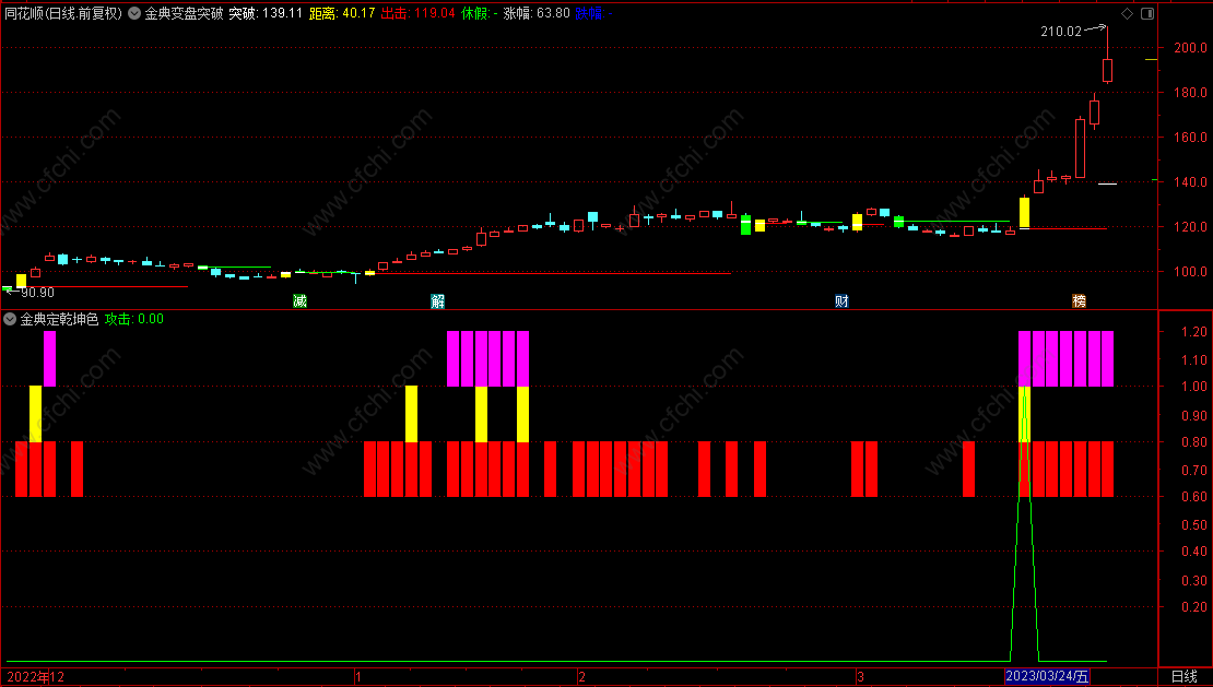 2、当天发生变盘分别用黄色K线和绿色K线提示;