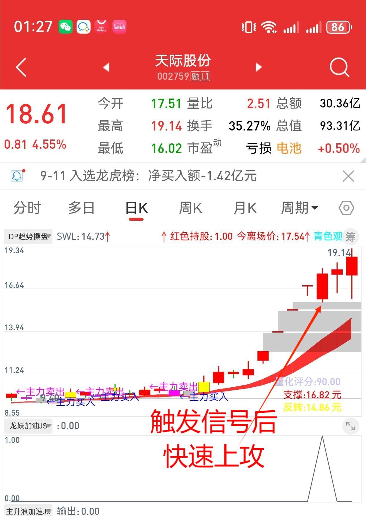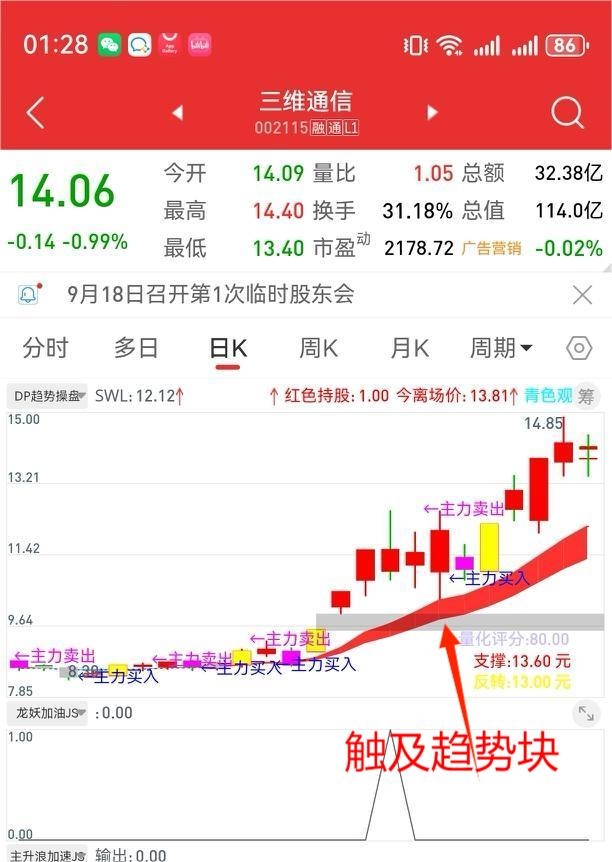 3. 中小阳线触发信号:股票断板,当时收3%以下小阳线,触发信号就买入,一般次日反包或有2-3日大涨。