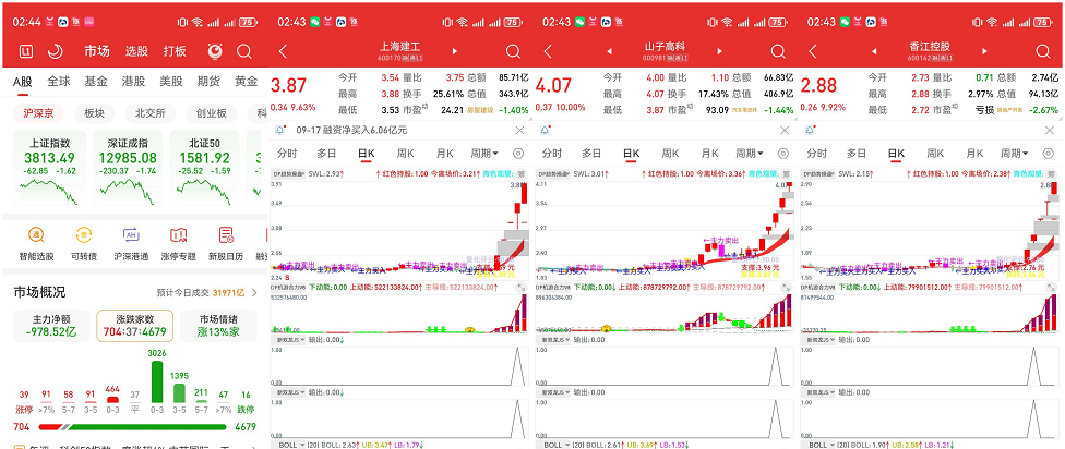 2025年9月18日大盘先是冲涨0.45%,快速调整回落跌幅1.62%,全市上涨个股仅为13%(截止14:44数据),很多涨停个股虽然连板数量不高,但纷纷破板,我们“双龙共舞”选股器独树一帜,9月15日-17日触发的3只高标股,今日表现依然挺立,接受了市场深度检验。