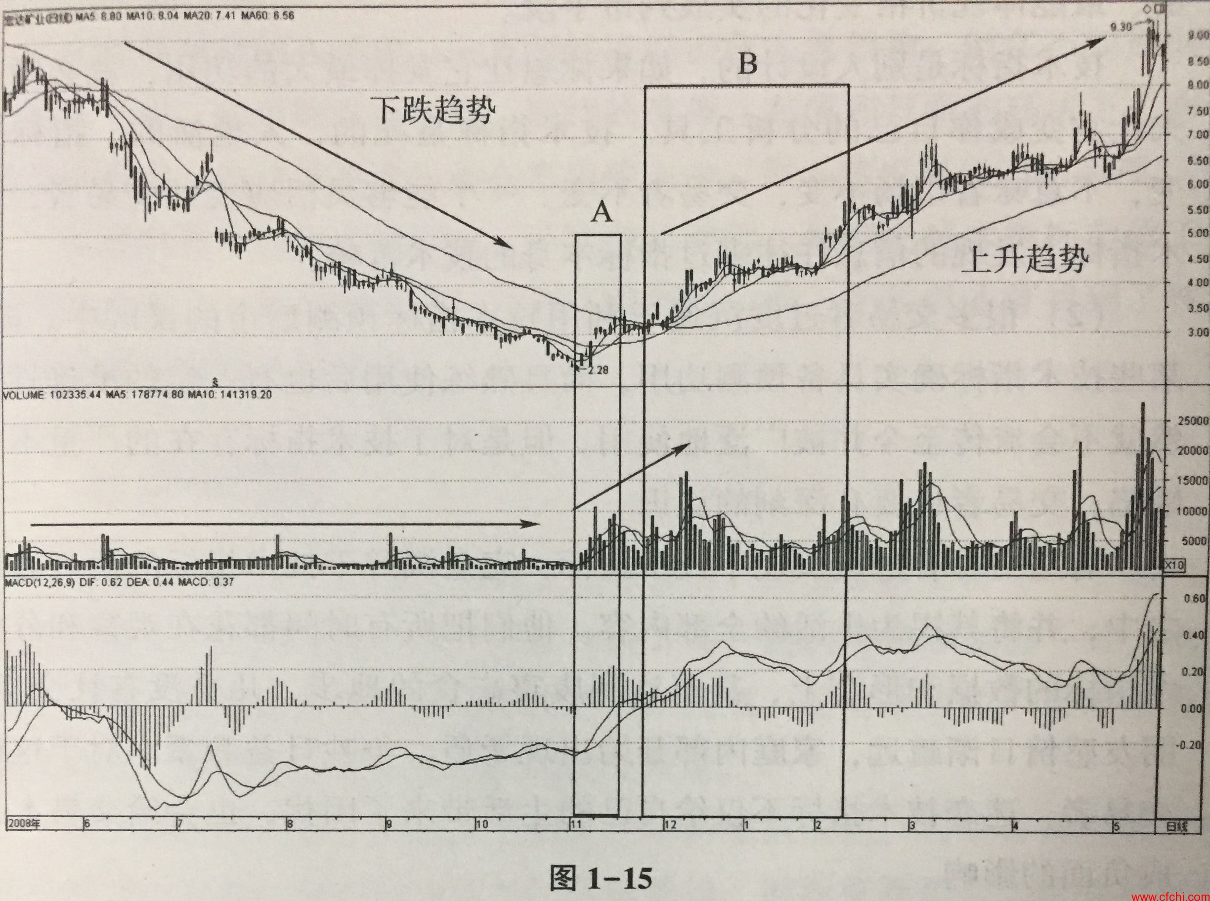 以图1-15为例,图中技术指标采用MACD。图1-15中A点价格上涨,MACD上穿0轴线,成交量出现明显放大。仅以A点的技术指标进行研判,交易者似乎能够得出价格转人涨势的结论,但是对于价格上涨的性质、级别、持续时间、幅度等问题,就难以有一个相对明确的判断。