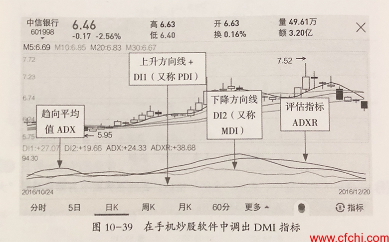 如图10-39所示,用户可以直接在手机炒股软件中调出DMI指标。