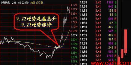 如上图所示,这种形态还是比较容易识别的,在尾盘呈现放量时迅速拉升,这时候进场的资金越多,表明了后市的涨幅就会更大。
