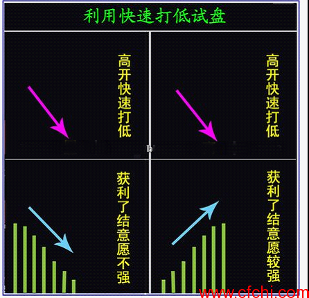 2)高开后快速打低。开盘高开后,主力通过快速打低股价的方式试盘,目的是判断盘中获利了解的意愿是否强烈。请看下图: