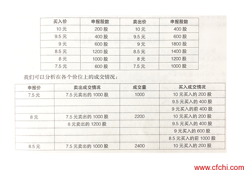 从以上的分析可以看出,申报价为8.5元所对应的成交量2400股为最大成交量,高于申报价8.5元的买人申报与低于申报价8.5元的卖出申报均可成交,等于申报价8.5元的买入申报全部成交,等于申报价8.5元的卖出申报并未全部成交。这也是投资者有时参与集合竟价,虽然委托价与竞价结果相同,但是没有成交的原因所在。
