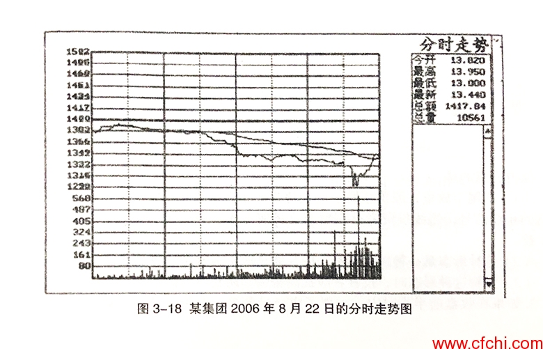 图3-18是某集团2006年8月22日的分时走势图。从图中可以看出,8月22日开盘后,这只股票就开始下跌,股价由开盘时的13.82元,下跌到14:38的13.00元,跌去0.82元。14:40,一笔228手的成交阻止了股价下跌,14:42,这只股票又放出了591手的大成交量将股价提升到13.14元,随后继续放量,直到收盘,股价最终被锁定在13.49元的价位(见下表),这一现象表明这只股票尾市有主力扫盘,后市有望涨升。事实也证明了这一点,第二天,该股就止跌反弹;第三天,该股发力上扬,股价最高达到14.01元,当日收盘价为13.88元。按最高价计十算,该股的后市升幅达7.77%;按收盘价计十算,升幅也达6.77%,短线收益十分丰富。