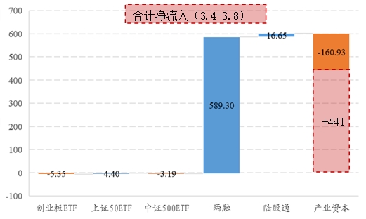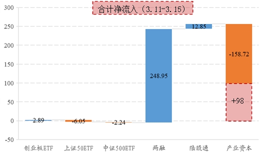 注:单位统一为亿元。ETF选取以基金中的ETF板块为基础,数据截至3月15日。两融代表融资融券余额周内的变化。产业资本以首次公告日股价、公告减持数量上限为股本计算减持市值。产业资本代表拟减持规模。