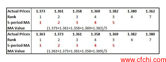 下表给出了一个移动平均线如何运作的简短示例。第一个框显示了特定时间点的移动平均值。注意,在本例中我使用的是5周期移动平均线,这意味着我使用的是货币对(本例中为欧元兑美元)最近5个价格的平均值。然后,在下面的框中,我们看到随着另一天的过去,一个新的价格出现了(1.363),它将所有的东西都向右推了一个位置。这意味着前一天排名第5位的价格(1.382)已升至第6位,因此我们不会在计算5周期移动平均线时使用它。这将意味着,每段时期之前排名第五的价格将被取消,而新的价格将以排名第一的价格进入。