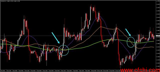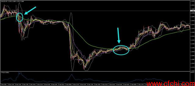 特别是,我们看到,指定有20个周期的短期移动平均线(紫色线)的移动速度比长期移动平均线快得多。200周期的移动平均线(绿线)和100周期的移动平均线(黄线)在价格变化方面的走势看起来要慢得多。橙色线表示50个周期的移动平均线,在较短和较长移动平均线之间移动当然,其它移动平均线也存在,任何可能的周期数都可以使用。