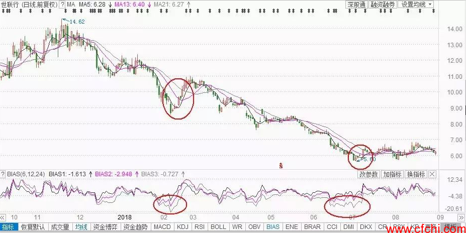 以世联行历史走势为例。世联行自2017年12月以来一路跌势向下,看起来处处都是抄底的机会,但实际上世联行属于典型的杀逻辑阴跌行情,超跌的机会并不多。根据BIAS指标,去年2月10日前后和7月5日前后是超跌的布局时机,后续都出现了不同程度反弹,但由于没有题材等因素驱动,24日乖离率在0轴附近就是卖出时机。