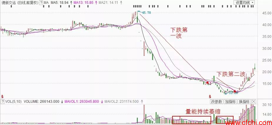 以德新交运历史走势为例。公司股价从45跌倒10元多,跌幅超过60%;下跌过程经过了2个典型波段,第2波彻底杀出恐慌盘;下跌过程持续缩量,第2波破位的时候放量下杀属于正常走势,看得出公司筹码稳固,潜伏资金少;公司具备股权转让和新疆板块的题材题材。