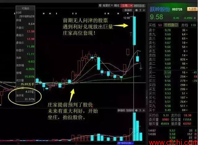 ⑷相对高位成交量突然放大,主力派发的意愿一般很明显的,然而,在高位放出量来也不是容易的事儿,一般伴随有一些利好出台时,才会放出成交量,主力才能顺利完成派发,这种例子是很多的。