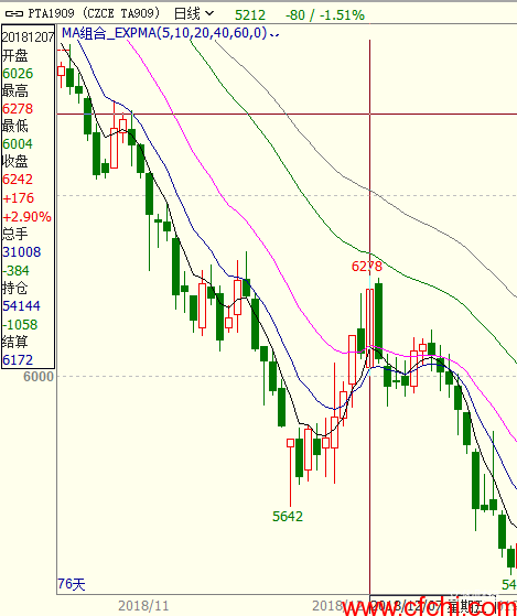 上图中PTA1909合约在2018年12月7日飙升近3%,但当日持仓和成交量却出现萎缩,表明多头和空头资金均不同程度离场,空方开始补货平仓,准备再次发力,果然期价在此后开始回落。