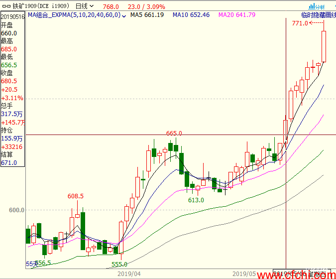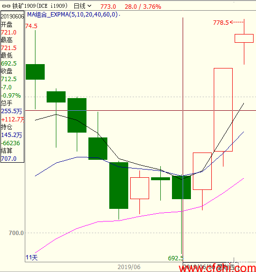 上图中铁矿石1909合约5月16日大涨逾3%,持仓和成交量均大幅增加,表明多头资金流入市场,大量建仓,期价在此后持续走高。