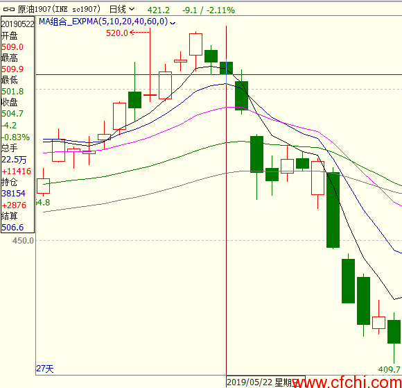 上图中原油1907合约在持续走高后,5月21日、22日连续两天出现阴跌的同时,持仓量和成交量均明显增加,表明空头资金流入市场,大量建仓,期价短期可能继续走低。
