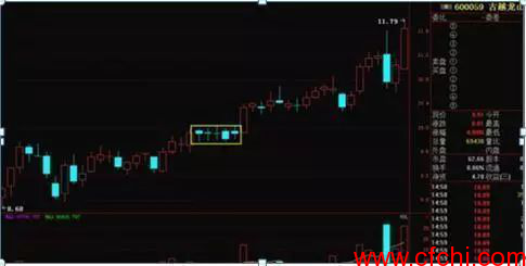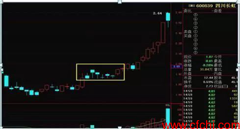 (3)某些上升途中的股票,股价在相对高位缩量横盘串阴洗盘后,某日大单上压横盘震荡,成交量放大,尾市收出阳线。此情况往往是快速拉升的前兆,应及时介入。