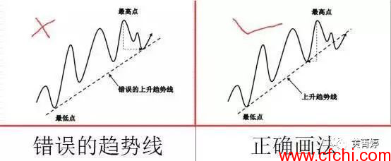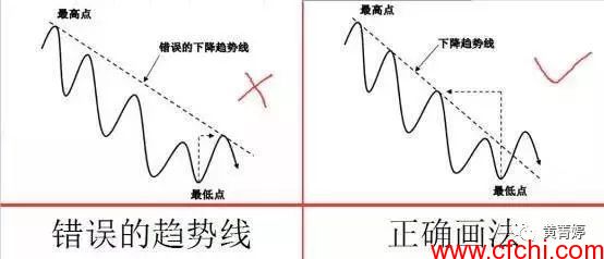 股市趋势线的正确画法和错误画法: