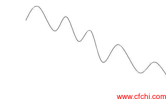 2、下降趋势,在某一周期内,市场价格不断跌破前一浪的低点,创出新低,在反弹过程中却不能升破前一浪的高点的过程,就是下降趋势。高点与低点都不断降低如图: