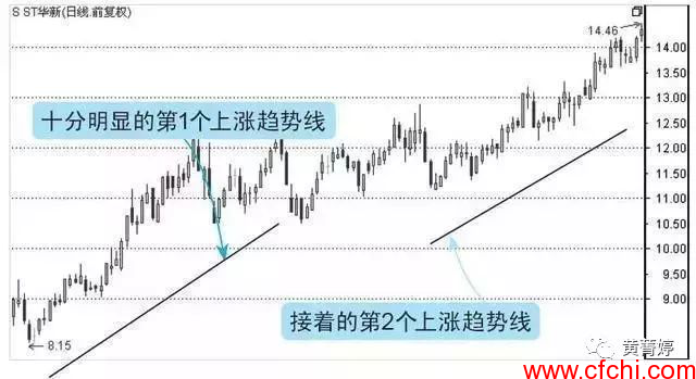 (1)当上升趋向线跌破时,就是一个出货讯号。在没有跌破之前,就是每一次回落的支持。