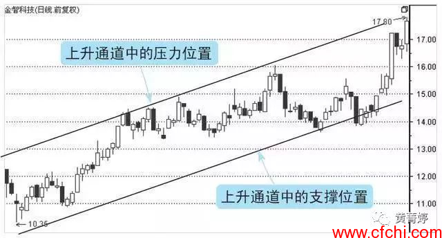 下图显示了典型的上升通道,这个上升通道是由压力线和支撑线共同构成的,就好像是鸟的翅膀一样缺一不可,只有两根线同时存在,才能构成上升通道。