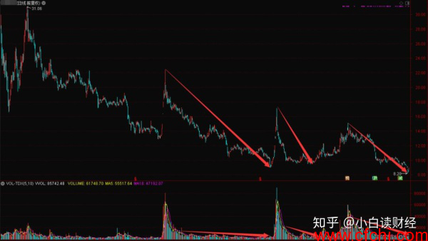 举个例子,下图的个股,处于长期的下降通道,每次放量反弹时,接着都是无量地下行,途中有过三处这样明显的过程。