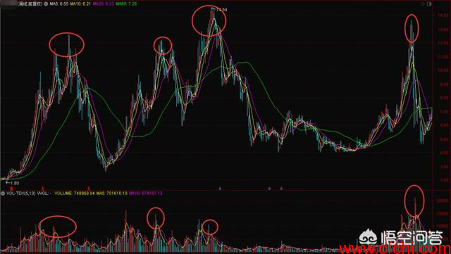 第二,结合成交量来分析。仅看价格不一定准,结合成交量,判断准确率就会高很多。股价大幅上涨后,放出天量后,离见顶就不远了。用量价关系来分析,上涨需要放量,越是上涨,越会吸引更多的资金参与,然后推向高潮,成交量达到天量,底部的获利筹码得以全部出掉,高位接盘站岗的只有“韭菜”。下图的个股,就是一个好例子,顶底都很明显,底部严重缩量,上涨过程中不断放量,直至放出天量,价格再也上不去了,那就意味着到顶了。