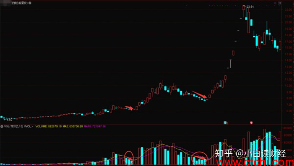 上升过程中,买盘积极介入,主力意图是做多。但是,主力一直拉升股价,会动用越来越多的资金,也会累积逐渐增多的获利浮筹,越往上拉,兑现压力就会越大。因此,聪明的主力,在上涨途中,会适当地压一下盘,把获利的浮筹洗出去,减轻后市的拉升压力,这种洗盘方式,最明显的特征就是缩量,越往下跌量能越小。