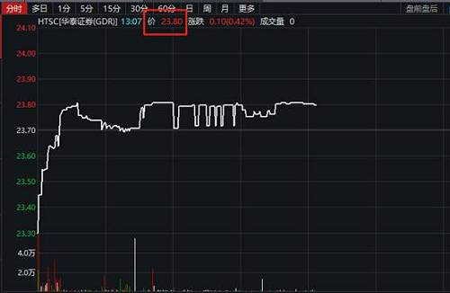 值得注意的是,在今日华泰证券A股下跌5.7%之后,目前这个价差已经缩小至2.56%。不过,价差正在持续缩小。华泰证券GDR今日开盘迅速拉升,截至北京时间20点30分,华泰证券GDR价格显示为23.8美元/份,涨幅达0.42%。