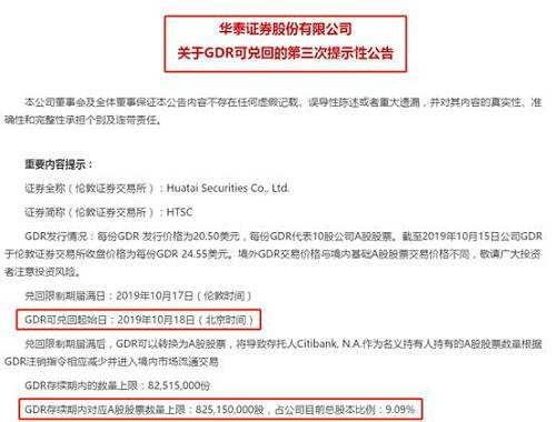 今年6月17日,沪伦通正式启动,华泰证券成为了沪伦通的首个GDR项目,率先实现了上海与伦敦资本市场的互联互通。10月17日,华泰证券发布了一份公告,公告指出公司本次发行的GDR将于2019年10月17日(伦敦时间)兑回限制期届满。兑回限制期届满后,GDR可以转换为A股股票,将导致存托人Citibank,N.A.作为名义持有人持有的A股股票数量根据GDR注销指令相应减少并进入境内市场流通交易。