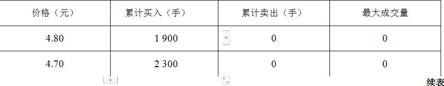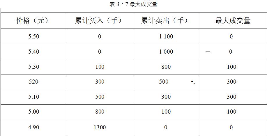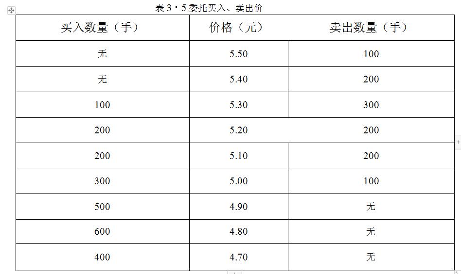 由表3-5可知,在委托卖出的数量中,5.30元的委托数量最多,为300手,以