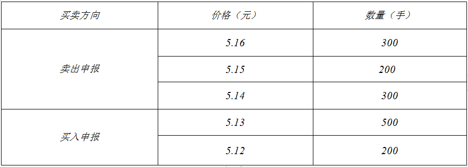 若此时有一笔该股票的买入申报进入系统,交易指令为价格5.16元,数量为400 手,那么根据卖出申报价格的价格顺序,应以5.14元的价格成交300手、以5.15元 的价格成交100手。