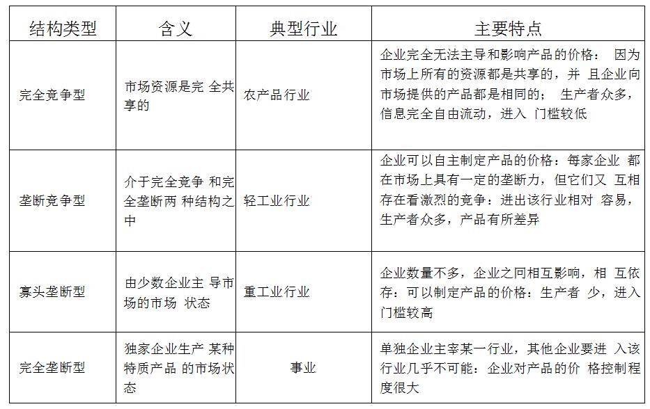 由于经济结构不同,町以将行业的市场结构分为完全竞争型、垄断竞争型、寡 头垄断型和完全垄断型,其具体介绍如表所示。