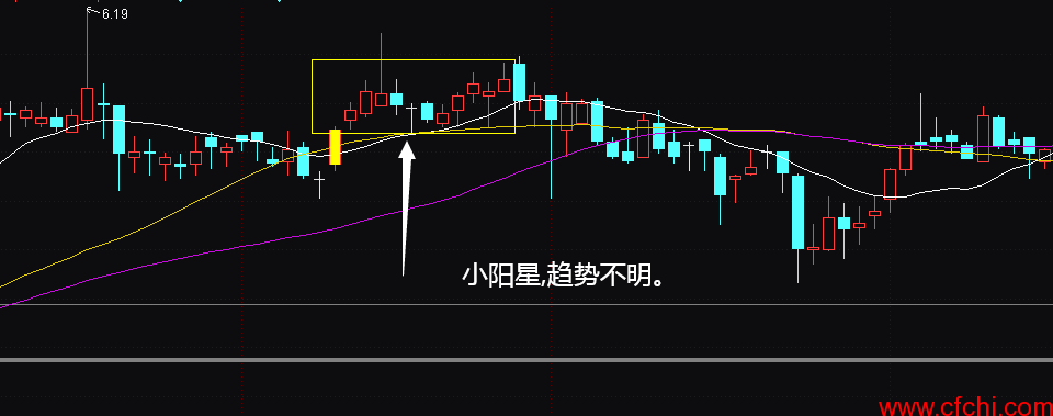小阳星的出现,表明行情正处于混乱不明的阶段,后市的涨跌无法预测,此时要根据其前期K线组合的形状及当时所处的价位区域进行综合分析。