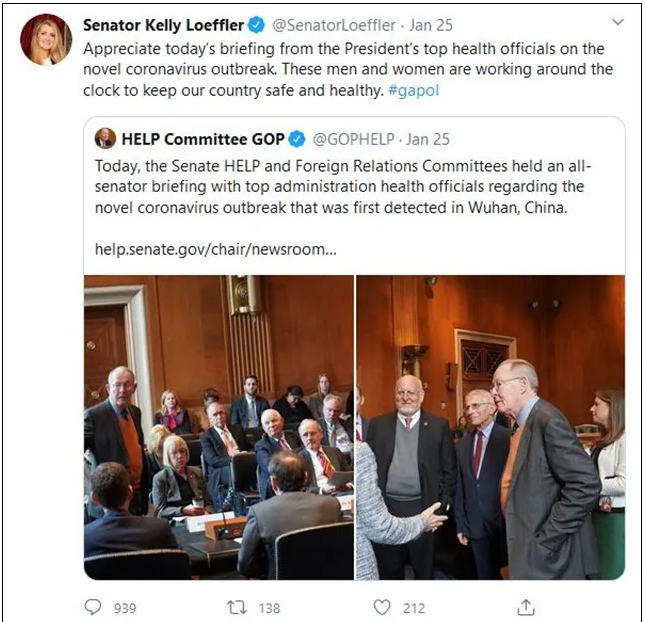 据《纽约时报》20日报道,2月13日,披露报告显示,范斯坦和她的丈夫卖掉股票总部在加州的生物科技公司“异基因疗法”(Allogene Therapeutics)价值150万-600万美元的股票,交易日期为1月31日和2月18日。英霍夫卖掉了包括贝宝(PayPal)、苹果以及布鲁克菲尔德资产管理公司总价值40万美元的股票,全部在1月27日这一天卖掉。莱夫勒和她丈夫被披露进行了27项股票交易,价值数百万美元,从1月24日开始交易。夫妻两人卖掉的公司股票包括埃克森美孚、罗斯百货和“汽车地带”(AutoZone)。同样在24日,莱夫勒参加了参议院援助与外交事务委员会举行的一场有关新冠病毒的简报会,并发了推特。“感谢总统的顶级卫生专家今天有关新冠病毒暴发的简报,”她在推特上写道,“与会人员都 莱夫勒1月25日推特截图这场简报会的与会人员包括美国疾控中心主任罗伯特·雷德菲尔德(Robert Redfield),以及美国国立卫生研究院过敏和传染病研究所主任安东尼·福西(Anthony Fauci)。