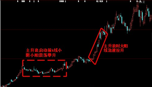 比如上图是近期某只大牛股主升浪启动前走势,启动前k线小阴小阳排列,走势上处于一个震荡攀升阶段,而进入主升浪之后,股价进入急速拉升阶段,不断拉出大阳线。