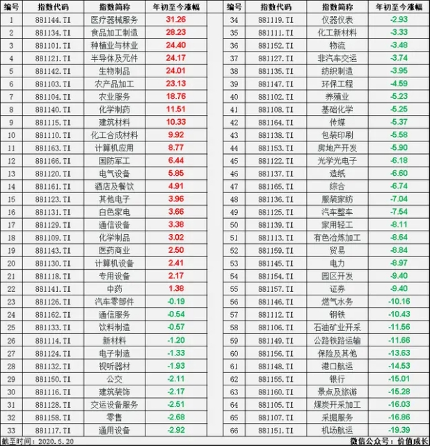 我们总喜欢绝对的比较自己的成败,却往往忽略了相对的比较,试问,除了22个涨幅为正的行业,剩下的44个难道在我国接下来发展的时间里会消失吗?疫情短期来看确实对大多数行业是一记重锤,难道疫情会永久伴随我们一生吗?