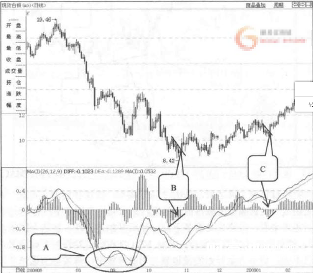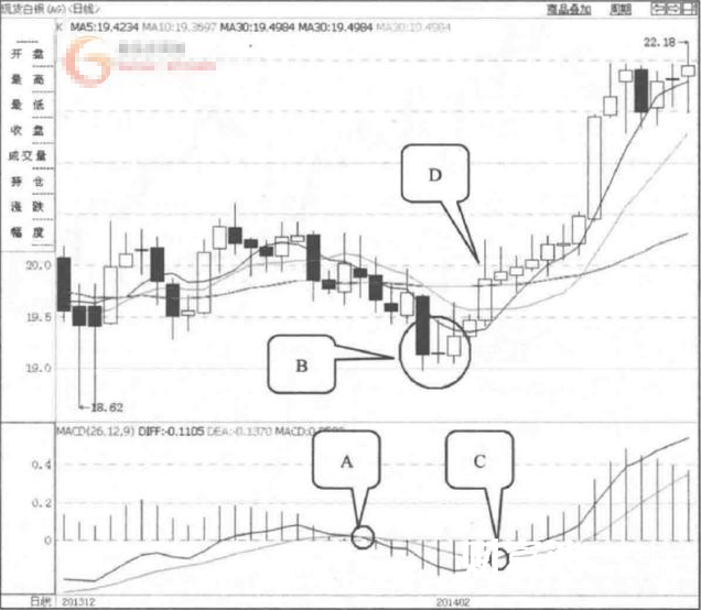 向下运动的DIFF线开始调头向上移动,并且向上穿过DEA线时产生了“黄金交叉”,这是一个做多信号,投资者们可以积极地进场做多。