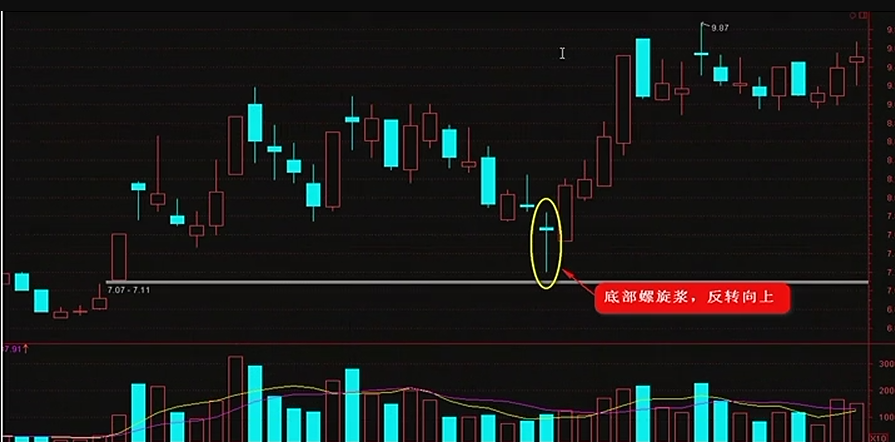 ②、在下跌行情中,如果是有一段较大跌幅之后出现,螺旋桨所起的作用是领涨。
