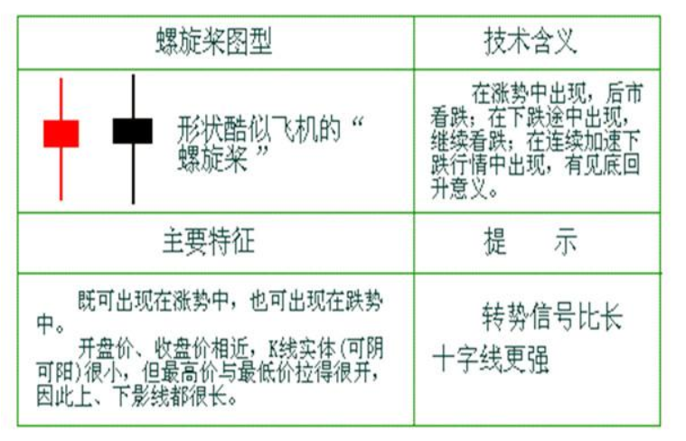 螺旋桨K线形态:K线实体是比较的短的,下方以及上方都分布着较长的上下阴线的小阴小阳线,因为这样的K线形态的形状就好比飞机的螺旋桨,所以命名就由此而来了。