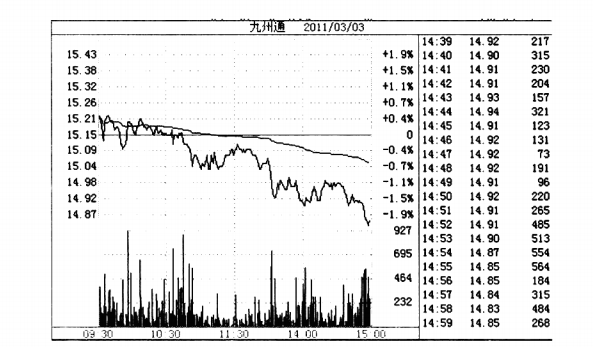 股票急涨急跌,个股的分时逆势走势在很多时候充满了变化,有的时候股价随指数同步走势,但在后期却一举扭转了弱势,出现强劲的上涨。九州通的股价就是这样的走势。开盘以后,股价随同指数下跌,只要指数下跌,个股便会随之下跌,指数的每一次创新低,对应的是股价同步的新低,对于这种跟随指数同步走弱的股票,投资者是要回避的!