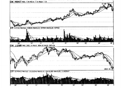 对于这种逆势走高的股票,只要涨幅不是太大,股价每一次在盘中创下新高时,就是投资者的买人机会!图中指数绝大部分时间运行于均价线之下,而华微电子的分时线却是长时间位于均价线之上的,通过股价的走势与指数走势的对比,股价的逆势特征是显而易见的!只要股价有逆势特征,不管指数跌得如何凶,都可以为投资者带来赢利的机会!