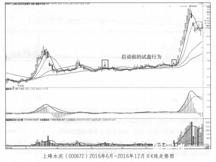 从上峰水泥启动前的走势中可以清晰地看到,在前高点的位置出现了几次标志性K线,这些K线都是主力做出来的,所以关注特殊位置出现的特殊K线就有着重要的意义。