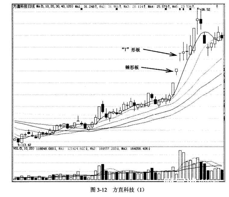 方直科技在2015年1月~2015年4月的K线走势如图3-12所示。在股价突破原有走势后,以一个锤形板和一个“T”形板的方式洗盘拉升。洗盘结束后股价的快速拉升仍然幅度不小。
