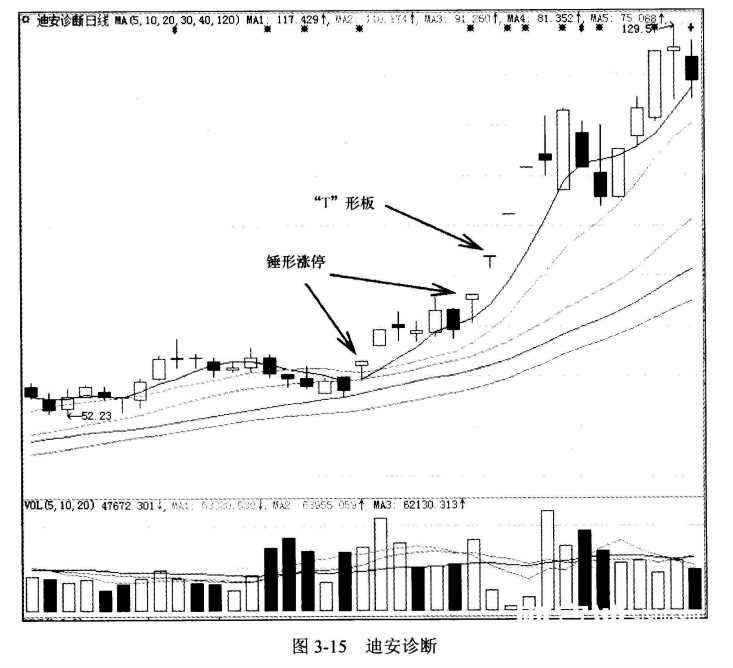 我们再看一下迪安诊断(300244)中的锤形涨停。图3-15是迪安诊断在2015年3月~2015年4月的K线走势图。股价在上涨的过程中出现两个锤形涨停和一个T形板的加速上涨形态。股价也从第一个锤形涨停时的60元左右上涨到高点时的129元,短短一个月的时间股价翻倍。那些勇追“T”形板和锤形板的投资者获利颇丰。