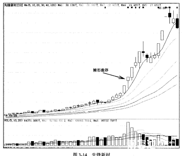 我们再看一个锤形涨停的案例。图3-14是先锋新材在2015年2月~2015年4月的K线走势图。股价在初升阶段出现一个锤形涨停,此后股价升势更勐。