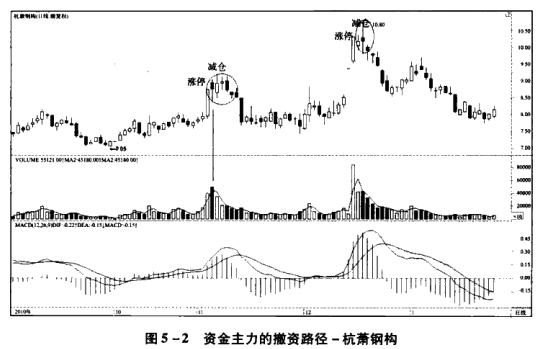 杭萧钢构﹐如图5-2,这样的撤资方式也比较常见,特点是撤资有一个开始点。在典型的资金大减时,资金的流出量非常大,但是股价的变化并不大,有时甚至是涨幅。在后期则出现股价的大的跌幅期。整个撤资过程比较清晰。